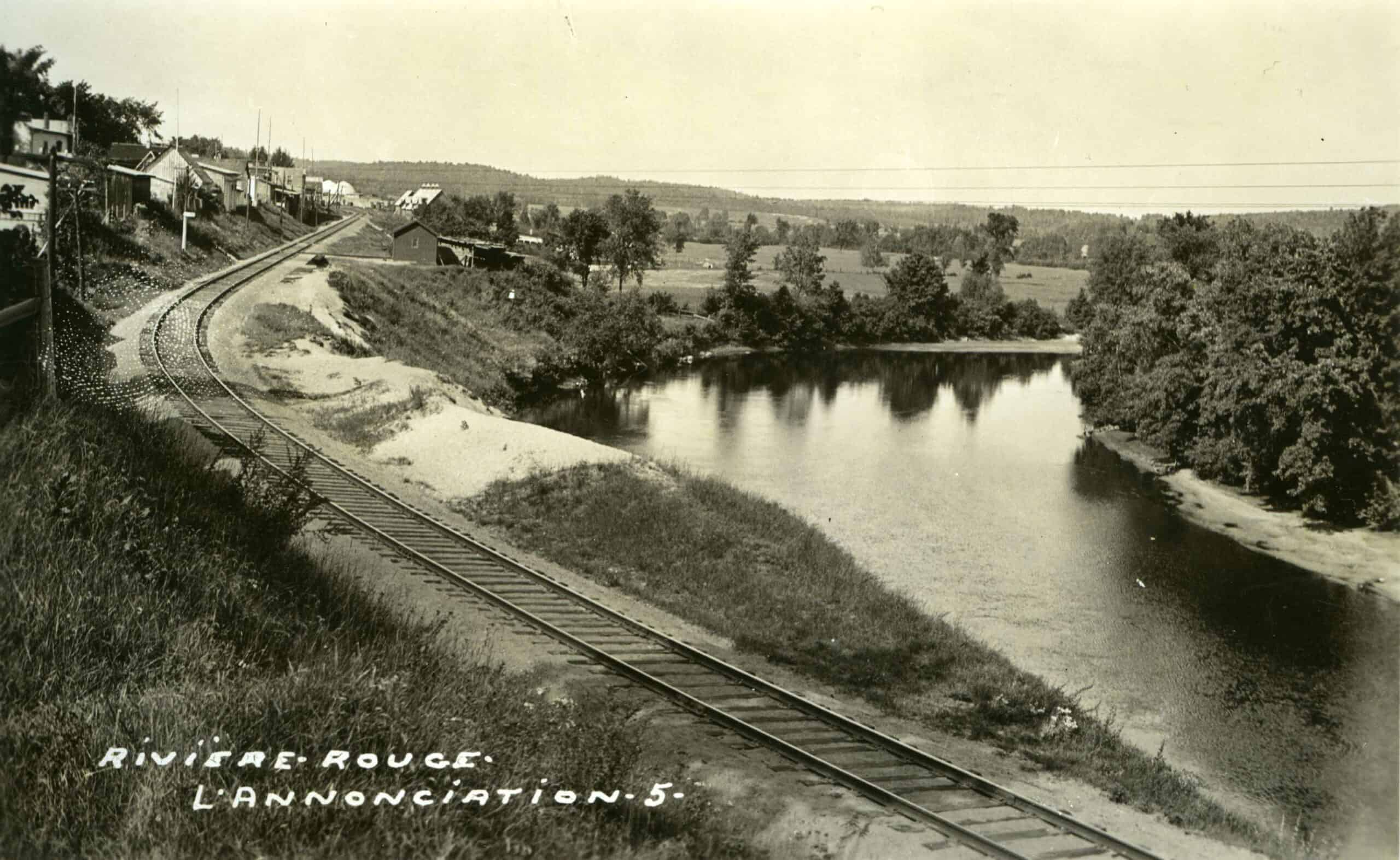 C’est l’année 1903 qui marque l’arrivée du chemin de fer à L’Annonciation. Ce nouveau contexte, celui d’être connecté aux grands centres, change la donne pour la municipalité du canton Marchand. D’une part, il est maintenant beaucoup plus facile pour les nouveaux colons de faire le voyage jusqu’à la Rouge. D’autre part, le chemin de fer rend accessibles les grands marchés de Montréal, voire les marchés internationaux. Un contexte qui contribuera à redynamiser le développement de L’Annonciation par le développement de nouvelles industries dédiées à l’exportation vers Montréal (bois de chauffage, beurre, charbon de bois, etc.) et par le développement d’industries touristiques centrées autour de la chasse, de la pêche et du plein-air. C’est d’ailleurs durant cette période, en 1908, que le village devient suffisamment populeux pour être détaché de la corporation municipale du canton Marchand ; le village de L’Annonciation est alors officiellement né.